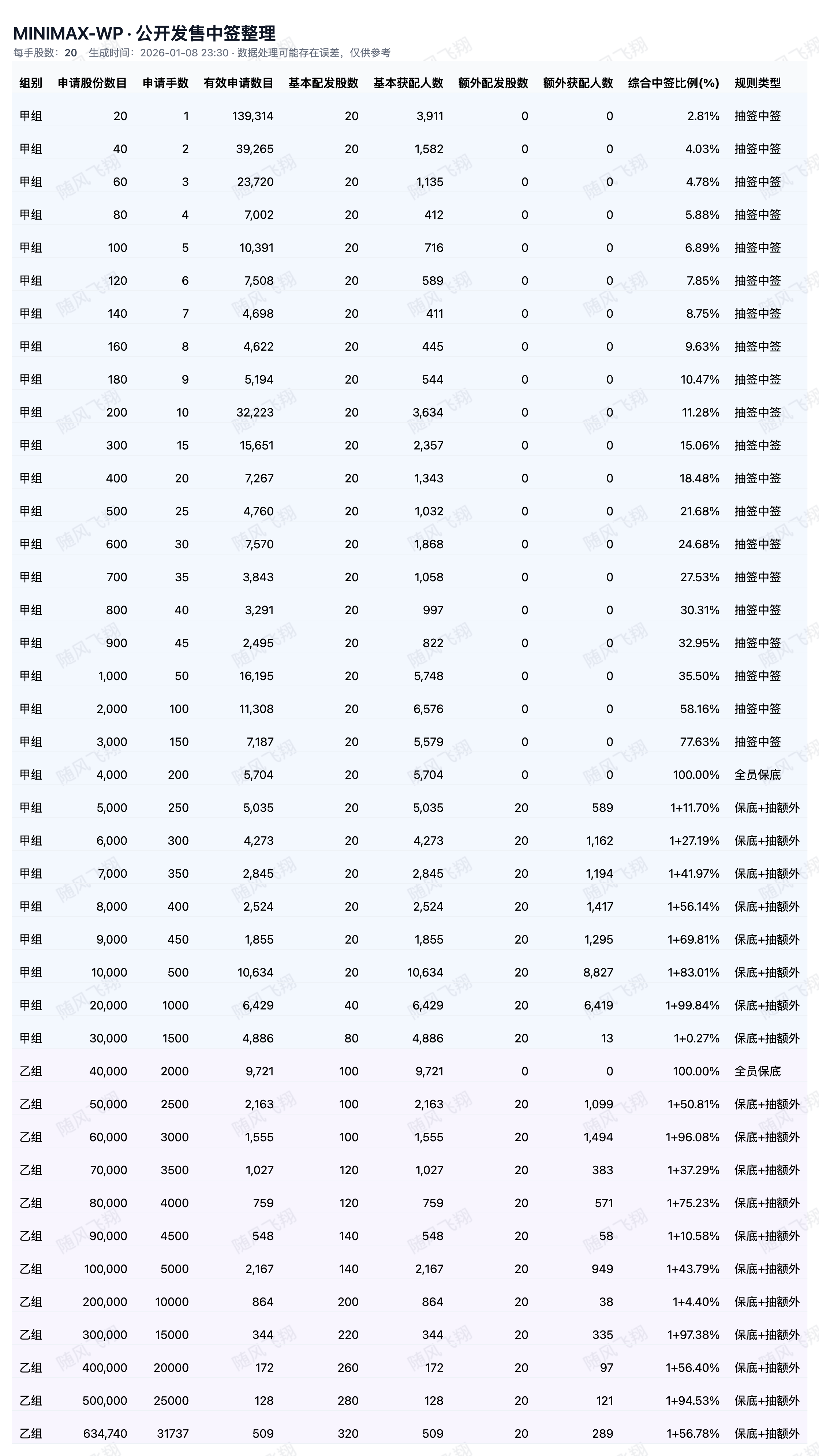 基于上市公司在交易所发布的配售公告中公布的各档位的中签情况,并通过人工智能统计计算分析,可能存在误差,仅供参考。