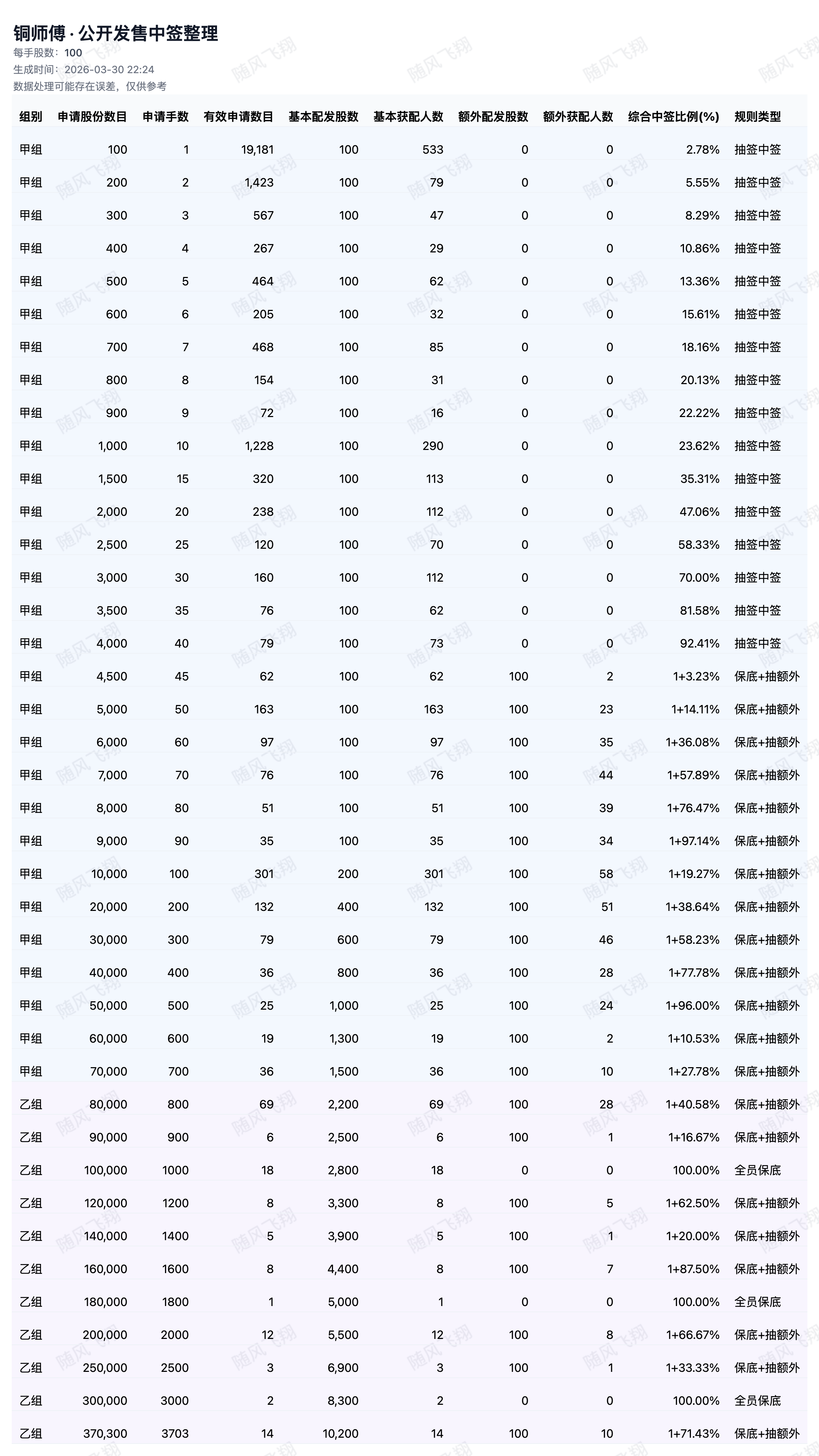 基于上市公司在交易所发布的配售公告中公布的各档位的中签情况,并通过人工智能统计计算分析,可能存在误差,仅供参考。