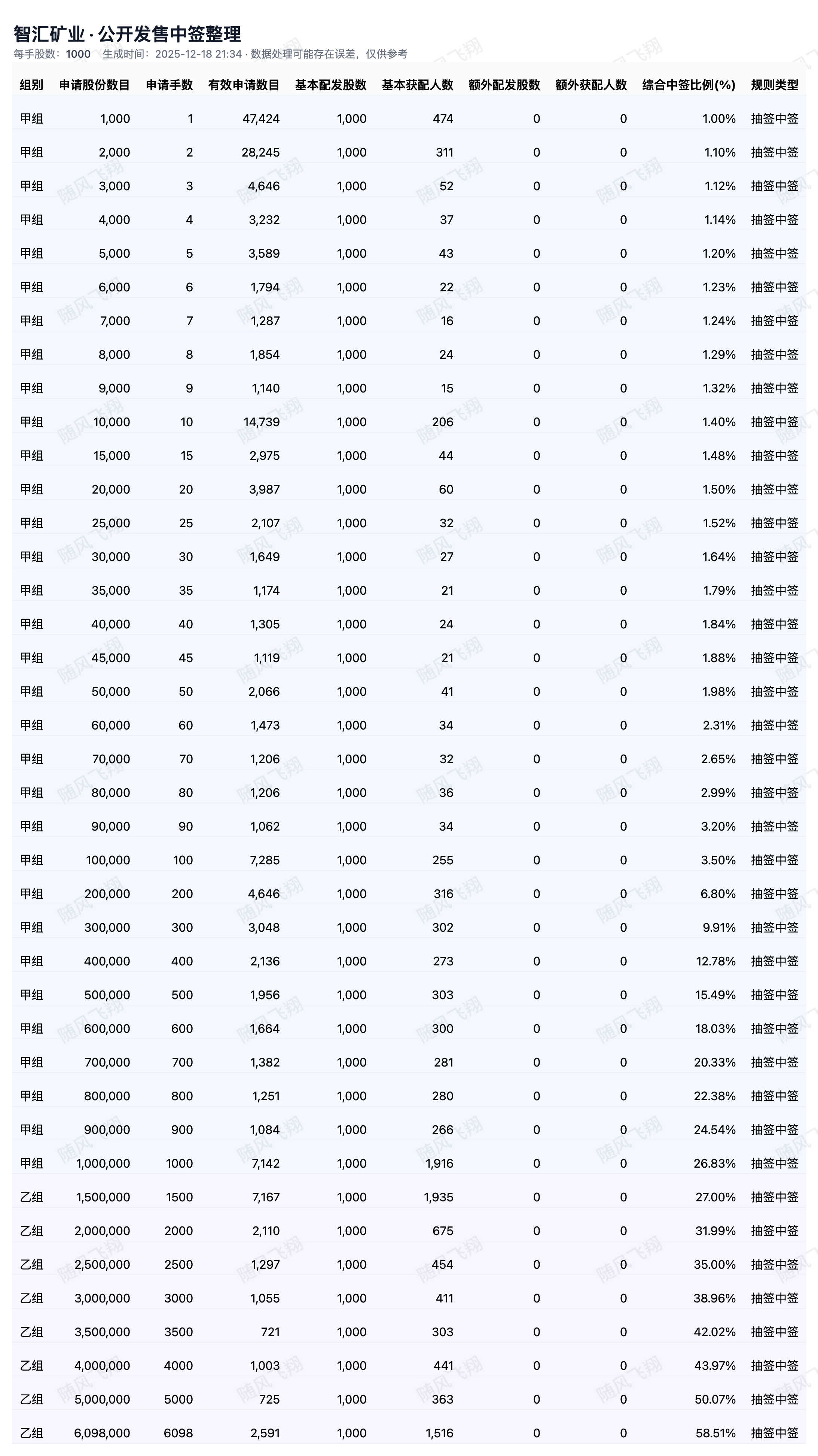基于上市公司在交易所发布的配售公告中公布的各档位的中签情况,并通过人工智能统计计算分析,可能存在误差,仅供参考。