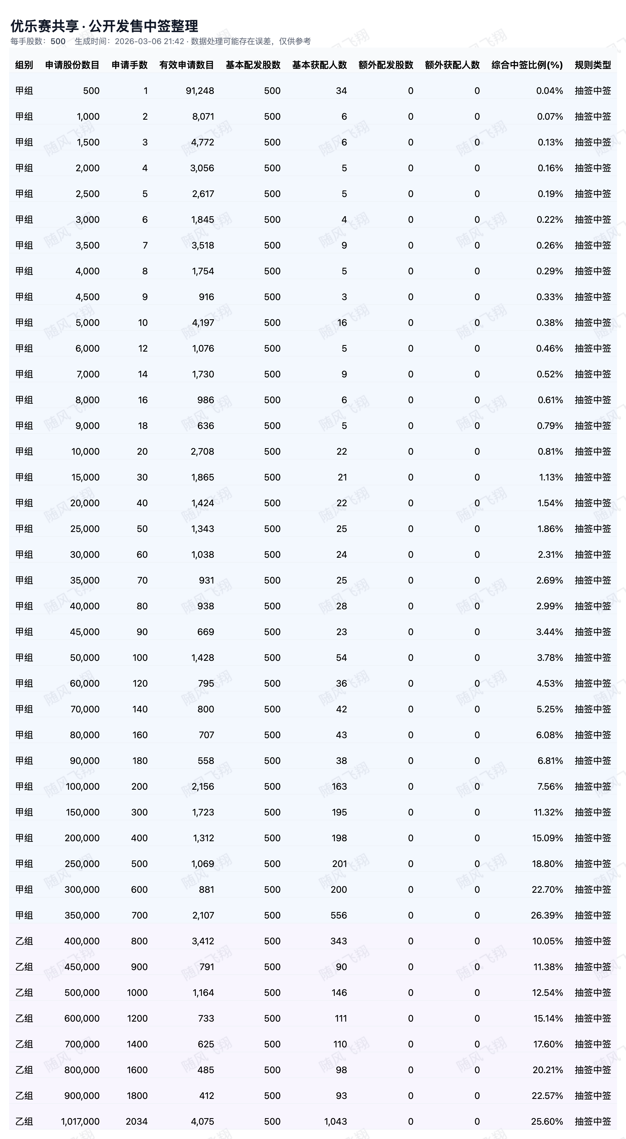 基于上市公司在交易所发布的配售公告中公布的各档位的中签情况,并通过人工智能统计计算分析,可能存在误差,仅供参考。