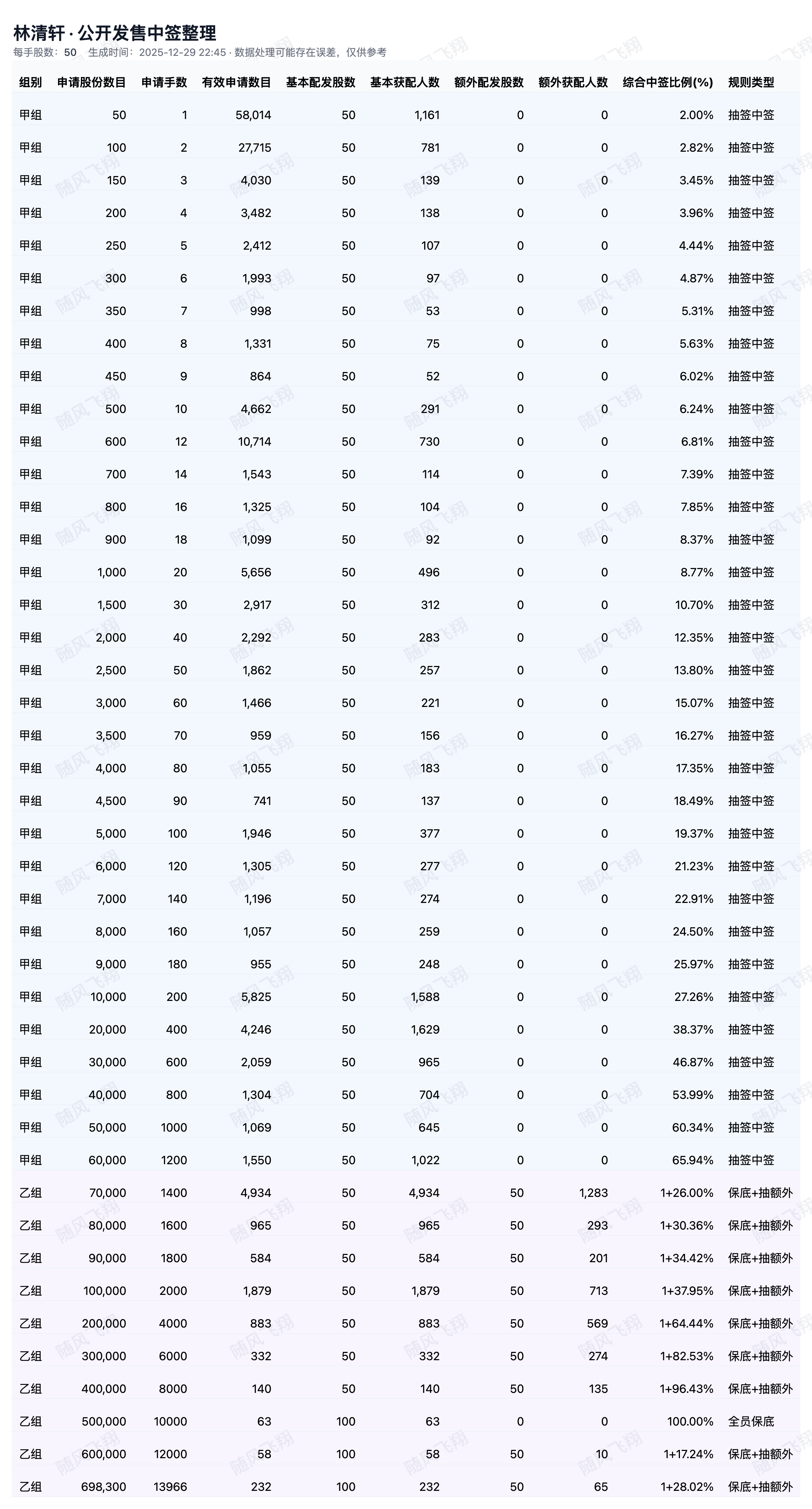 基于上市公司在交易所发布的配售公告中公布的各档位的中签情况,并通过人工智能统计计算分析,可能存在误差,仅供参考。