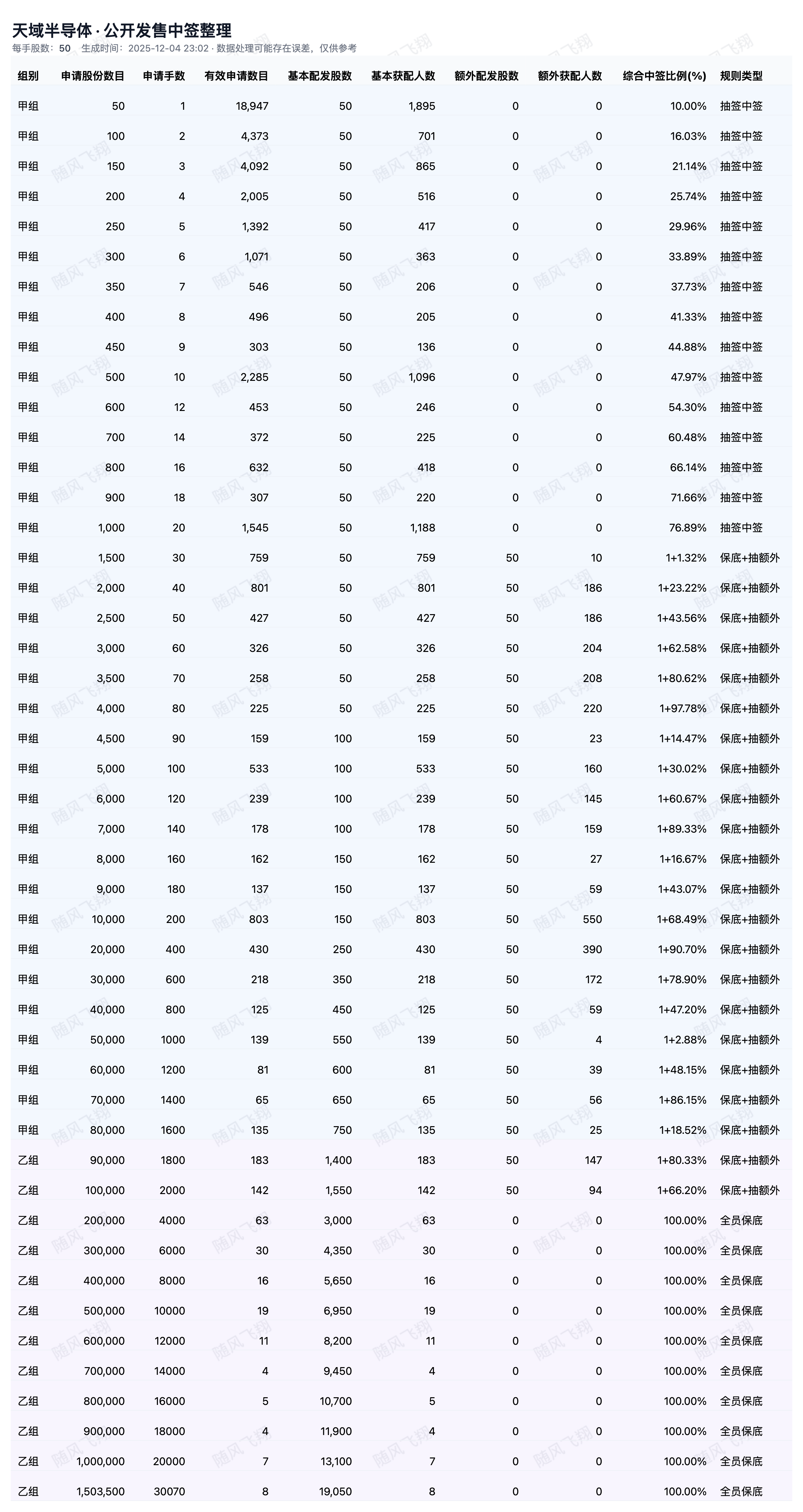 基于上市公司在交易所发布的配售公告中公布的各档位的中签情况,并通过人工智能统计计算分析,可能存在误差,仅供参考。