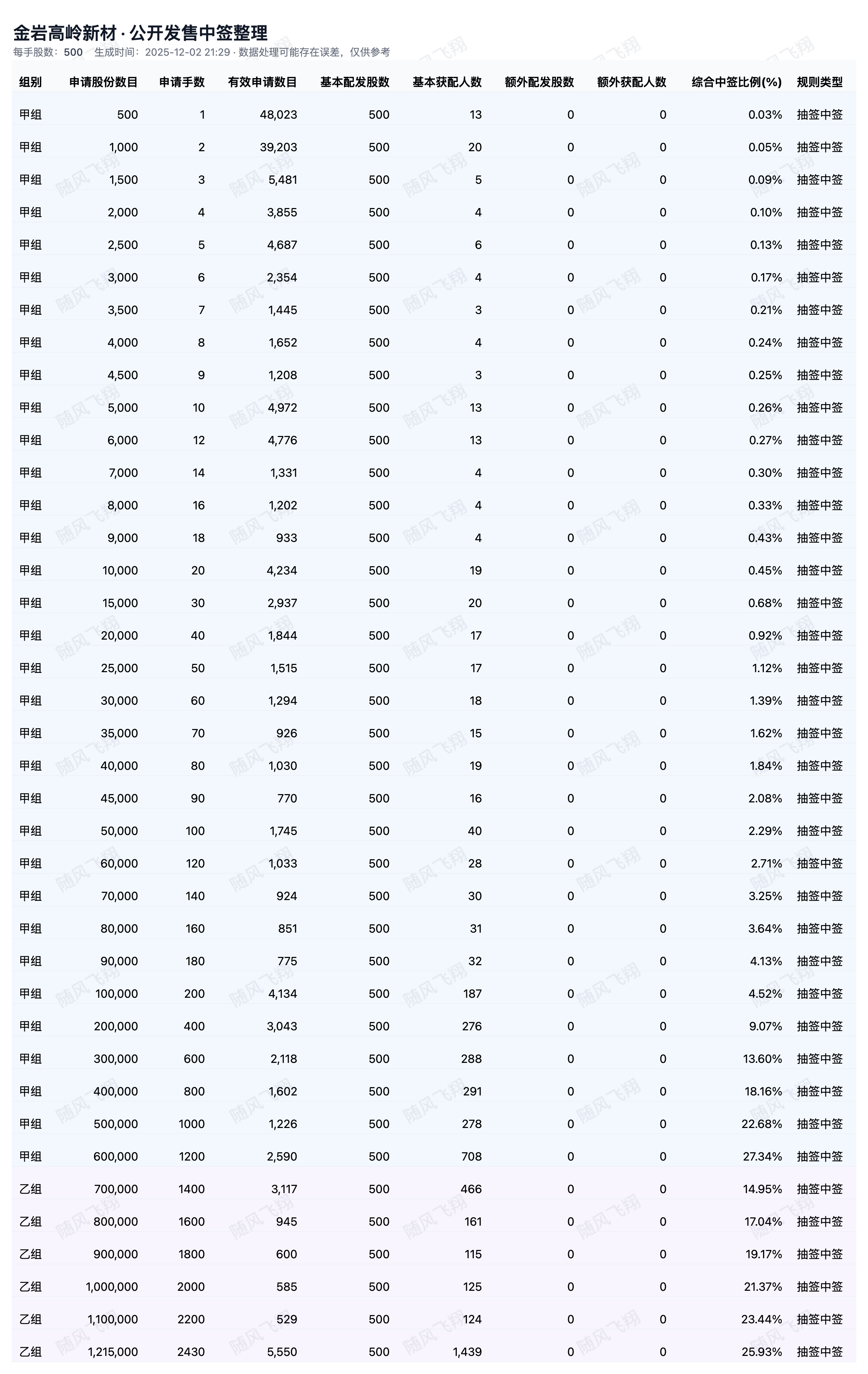 基于上市公司在交易所发布的配售公告中公布的各档位的中签情况,并通过人工智能统计计算分析,可能存在误差,仅供参考。