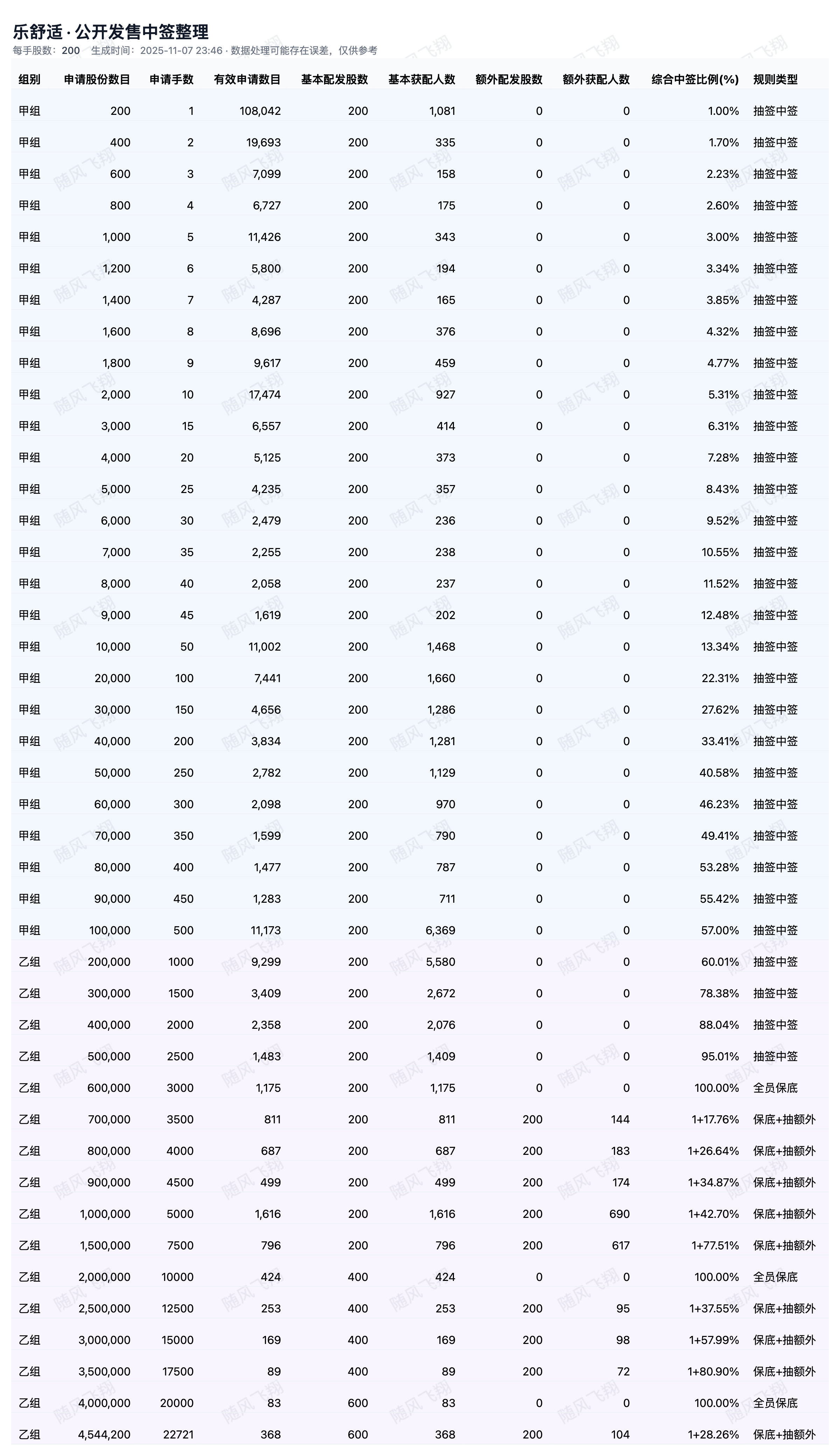 基于上市公司在交易所发布的配售公告中公布的各档位的中签情况,并通过人工智能统计计算分析,可能存在误差,仅供参考。