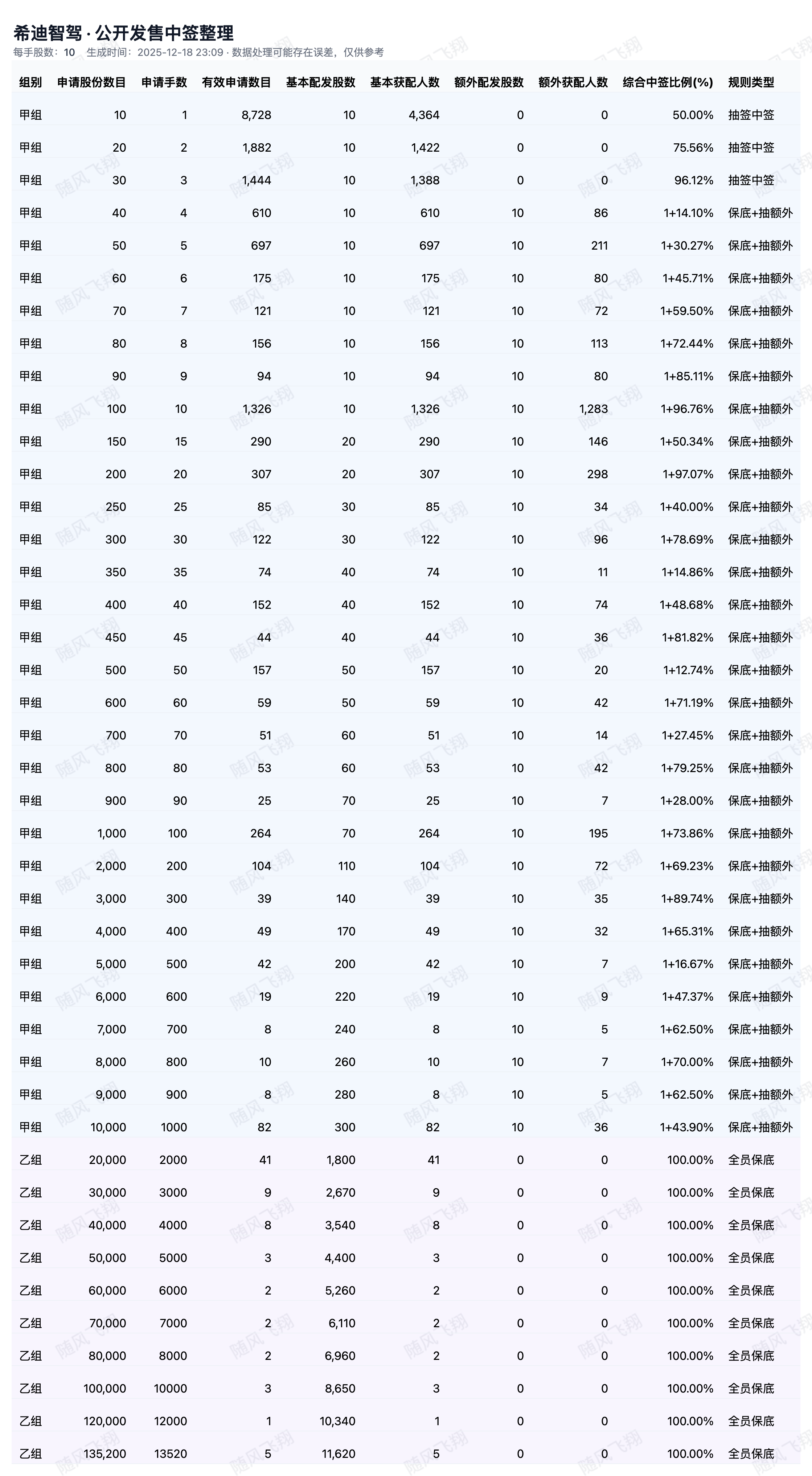 基于上市公司在交易所发布的配售公告中公布的各档位的中签情况,并通过人工智能统计计算分析,可能存在误差,仅供参考。
