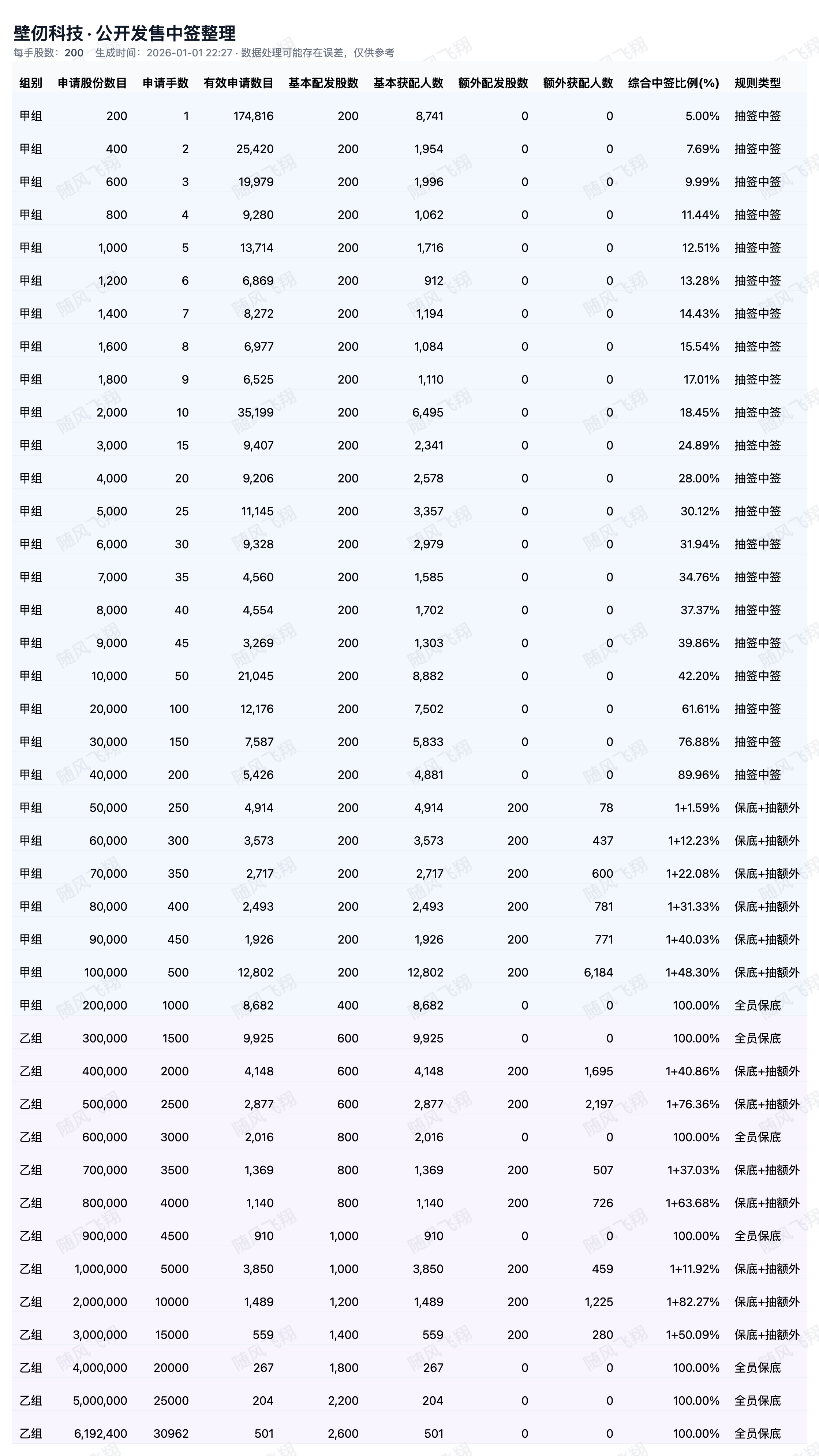 基于上市公司在交易所发布的配售公告中公布的各档位的中签情况,并通过人工智能统计计算分析,可能存在误差,仅供参考。