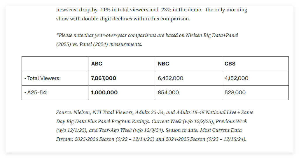 改版后首周的数据出炉,跟Norah O'Donnell最后一周的节目相比,无论是总人数还是核心年龄段人数来看,还有下降。而当周有华盛顿撞机事件,ABC和NBC的收视率都有微幅上涨。(来源: https://www.adweek.com/tvnewser/week-of-january-27-2025-evening-news-ratings/ )仅从目前冷冰冰的收视率数据来看,可能很难说这次改版成功吧……
