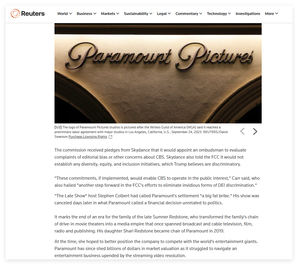 此外,派拉蒙和天空之舞的合并、CBS在《60分钟》节目被特朗普起诉要求赔偿、以及新的派拉蒙天空之舞宣布要有“偏见观察员”之类的或许也有关系。