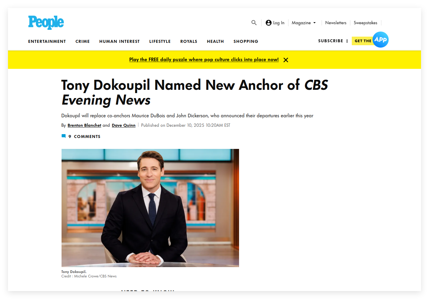 接下来,CBS NEWS晨间节目主持人Tony Dokoupil将接过CBS Evening News的主持棒。新的节目预计将在2026年01月05日开始。