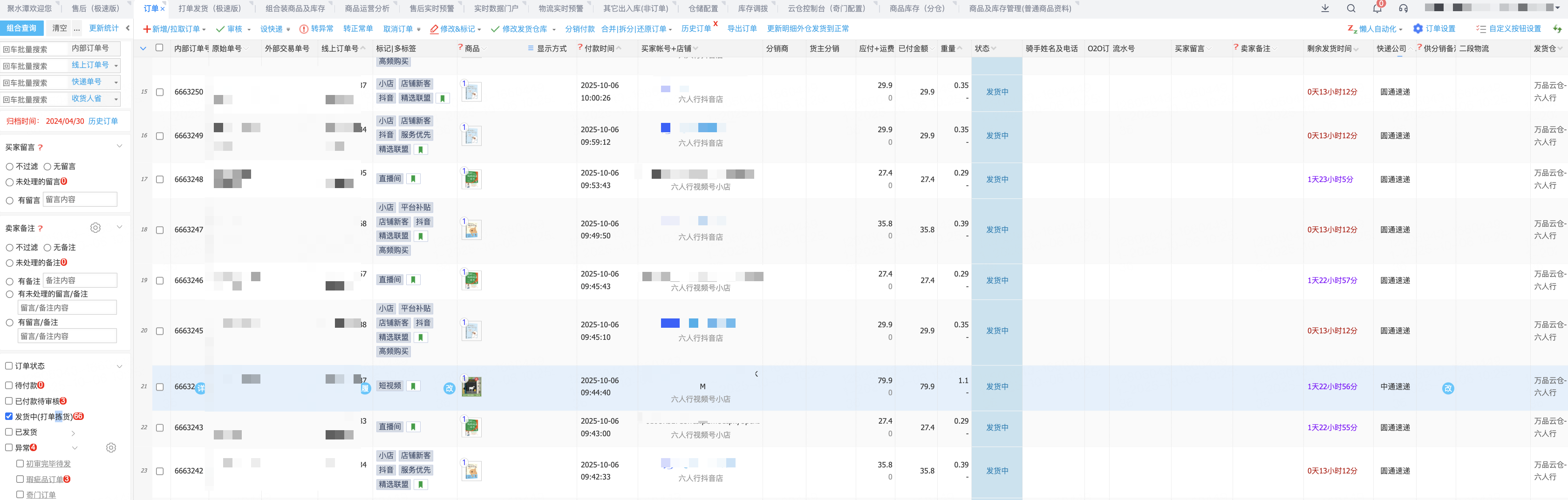 不过虽然很复杂,但是大部分聚水潭都提供了自动化工具,可以减轻压力。主要处理的还是那些有异常的情况。比如顾客为了省运费,写一个河南省乌鲁木齐市这种双地址订单需要摘出来、顾客可能同ID下了好几单也许需要合并订单、如果一个顾客买的太多又可能需要拆分订单等等吧。