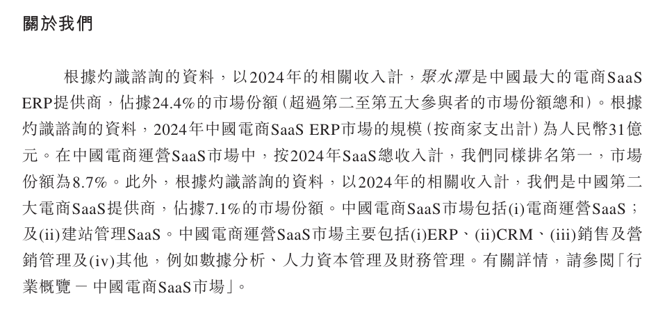 根据招股书的介绍,聚水潭自称是中国最大的电商SaaS ERP系统的提供商,但是很多上市公司的市场地位都是来自一些付费的咨询公司,并且统计学是门学问。所以我给我司当年换ERP系统的时候并不想看这个东西,而是有别的邪门方法。(来源