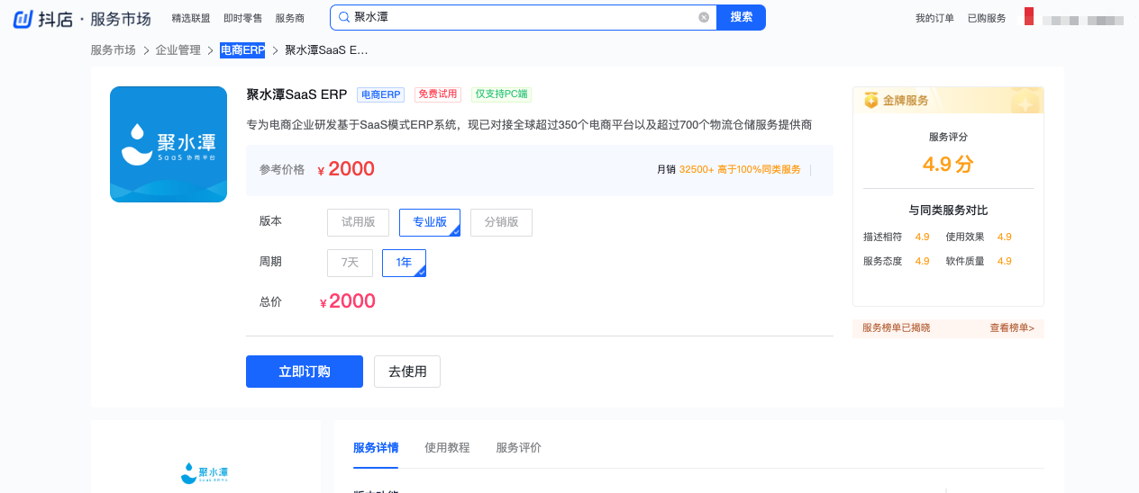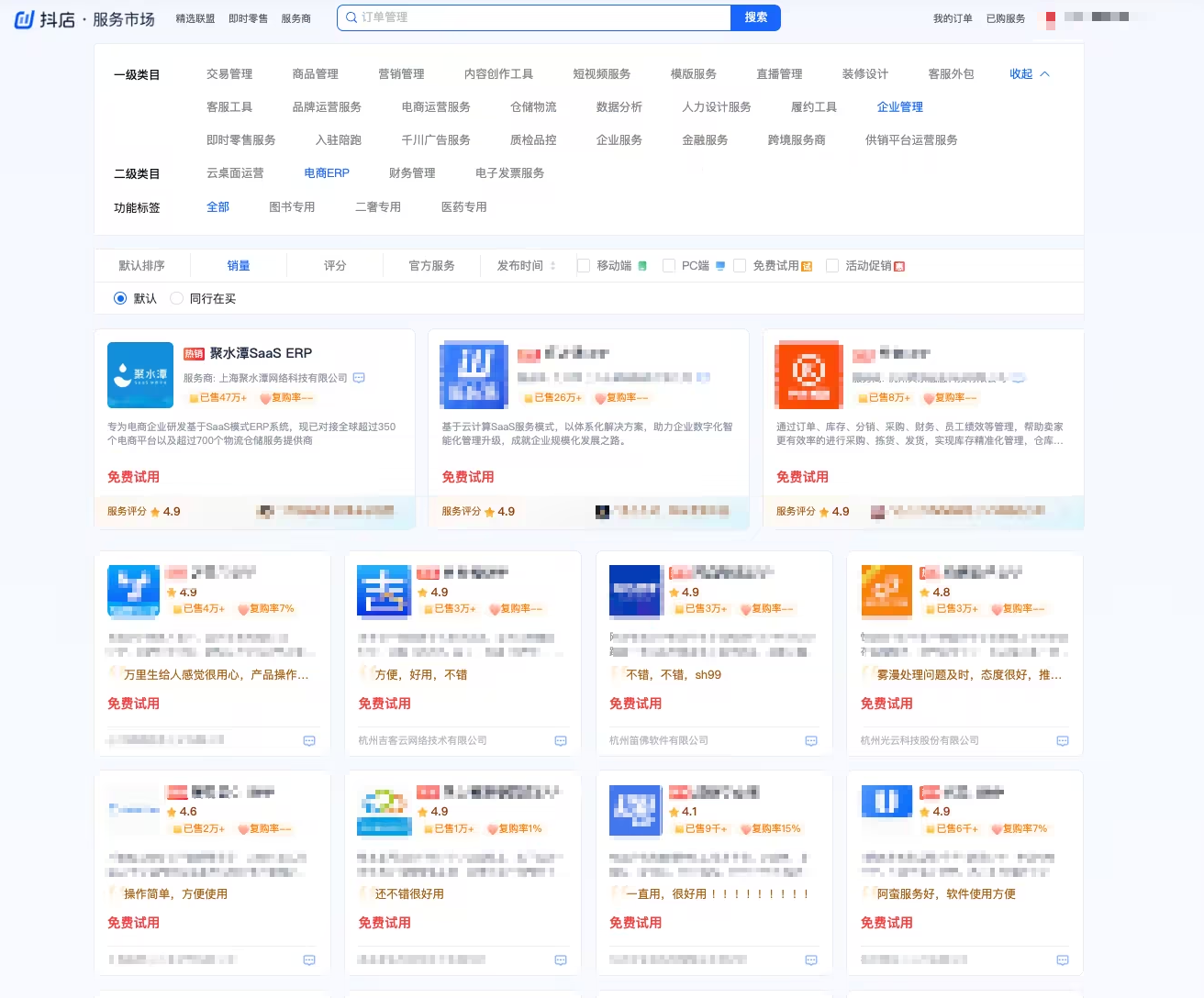 以下是抖音服务市场,电商ERP分类下按照销量排序的情况(截图时间2025年10月8日16:22):