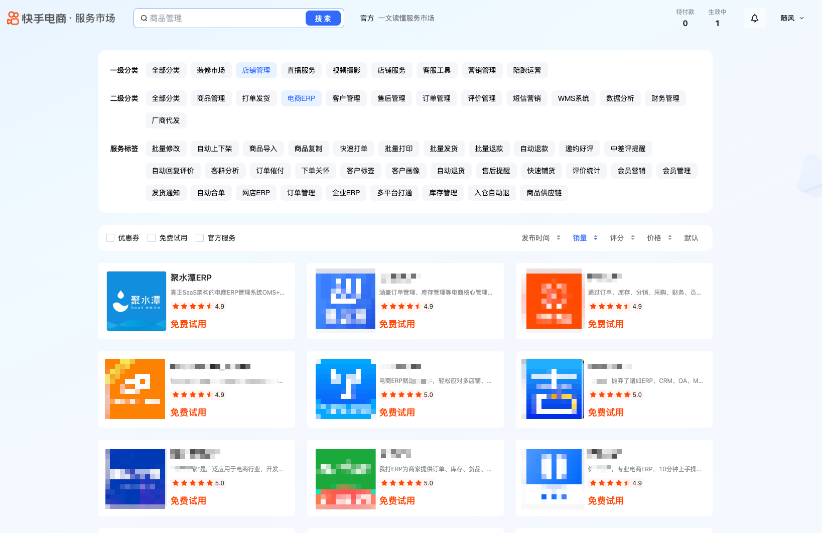 以下是快手服务市场,电商ERP分类下按照销量排序的情况(截图时间2025年10月8日16:34):