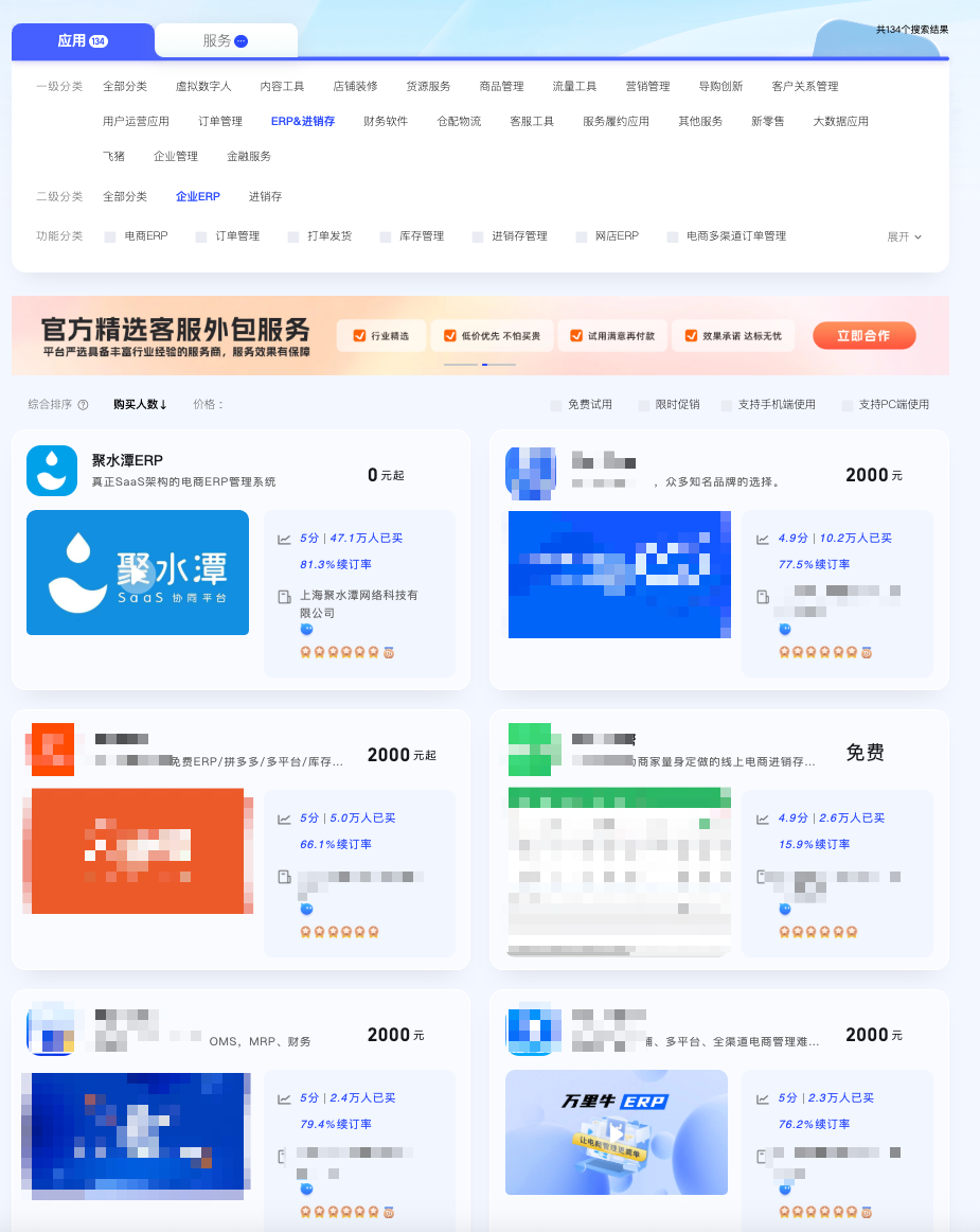 以下是淘宝服务市场,电商ERP分类下按照销量排序的情况(截图时间2025年10月8日16:38):