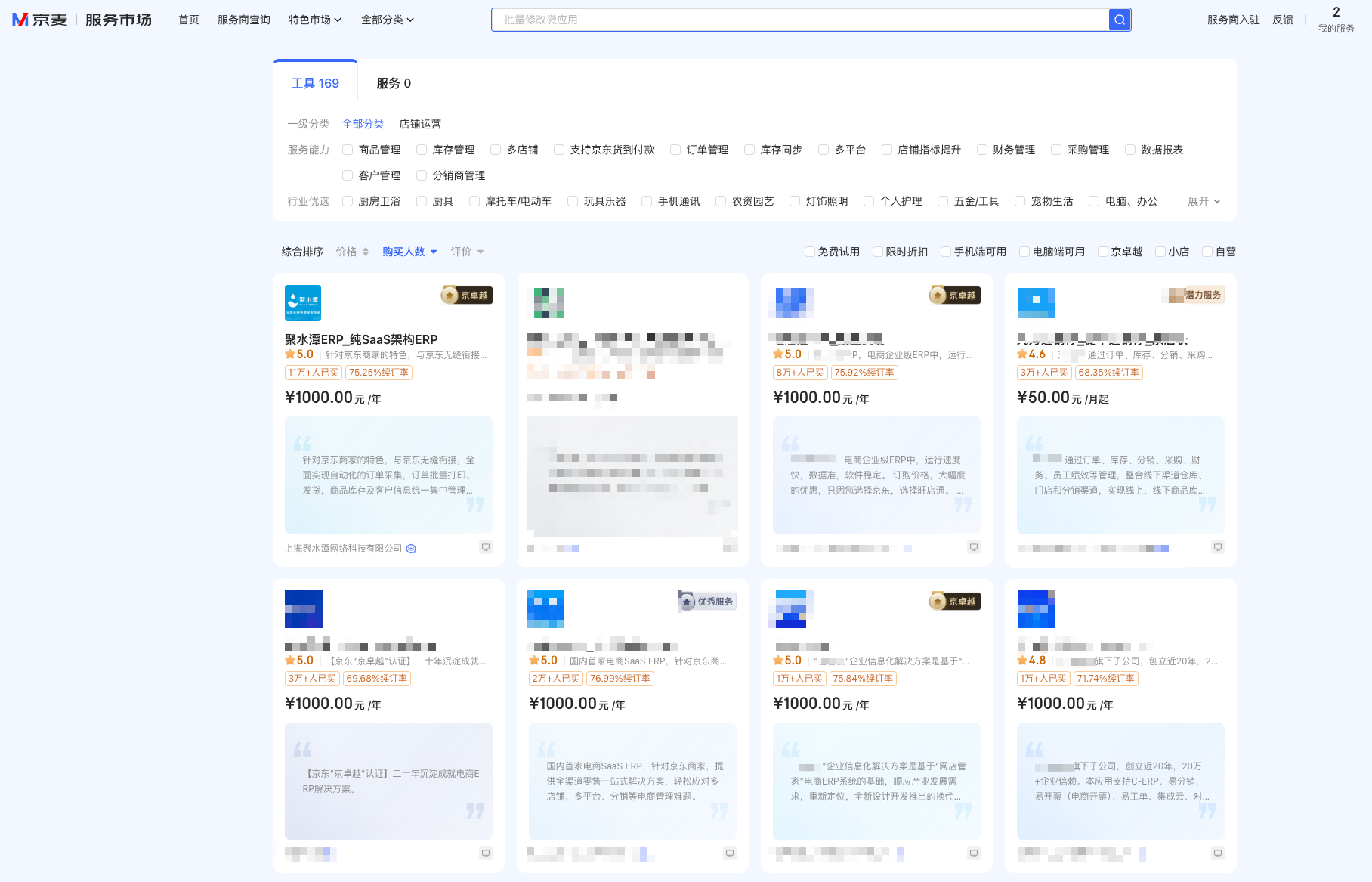 以下是京东服务市场,电商ERP分类下按照销量排序的情况(截图时间2025年10月8日16:46),有一个被全部打码了是因为觉得这个产品似乎是因为分类划分的漏网之鱼,跟ERP似乎没啥关系,就不展示了: