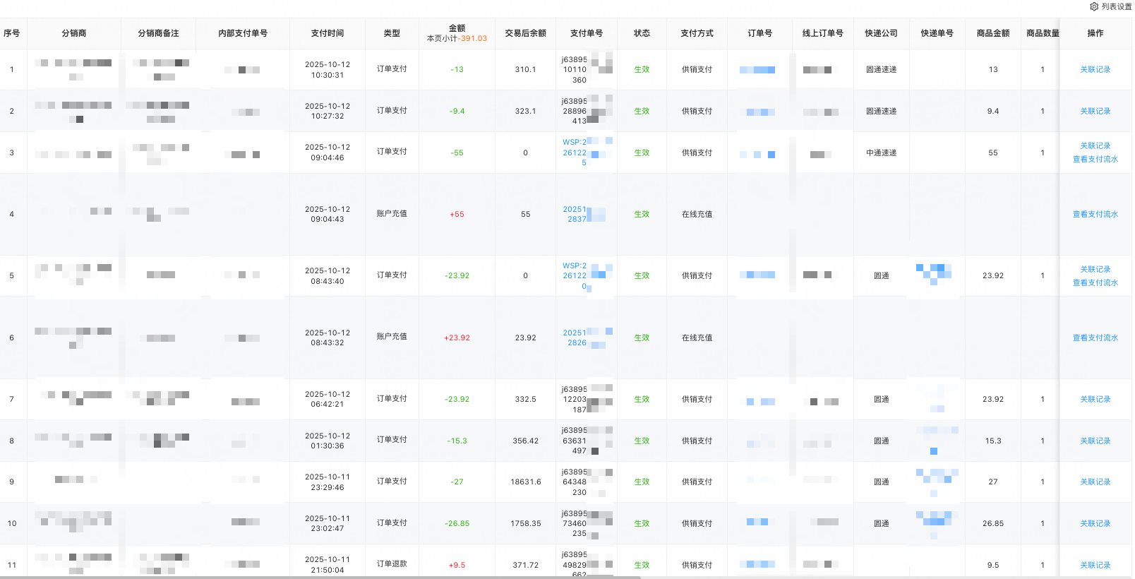 因为规模的问题,不少合作方都有聚水潭的系统,可以直接通过聚水潭的分销系统把渠道的订单推送给我们,我们再交给相应的库房处理,一旦发货系统直接自动同步运单号给渠道的平台,全过程都减少了人工的参与,也能减少错误的发生。钱的问题也能能处理的更好了,对于后付费的大客户,无论是发出的情况还是售后退款的情况有了更明确的记录,可以方便汇总账单。对于小客户,聚水潭还和网商银行联合,开发了在线支付的工具,可以根据发货量灵活的充值,用多少给多少,避免大额的垫款。