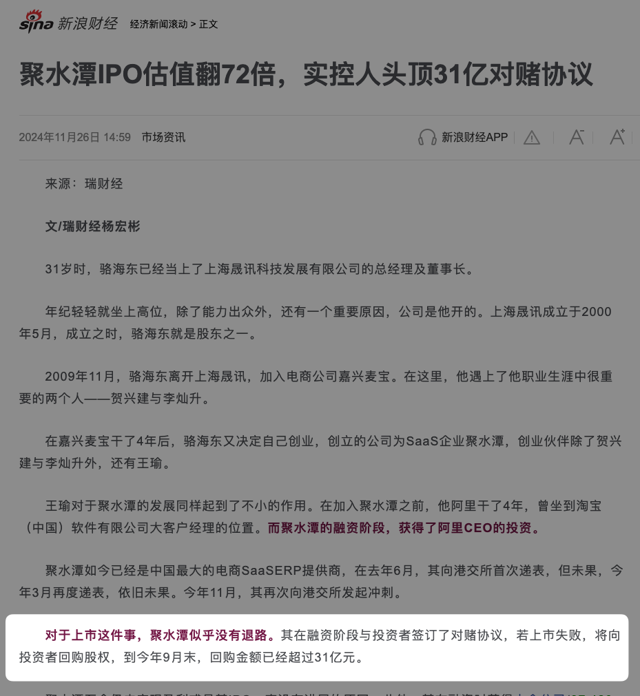 之前提到了我们一直是按年续费的,虽然一次性续费多年有优惠,但是我一直感觉不太放心,因为之前一直听闻聚水潭处于亏损的状态。根据招股书,2024年才扭亏盈利1000多万。此外还有媒体报道聚水潭存在对赌协议,并且根据36氪的数据,2020年后四五年的时间,聚水潭也未获任何新的融资。