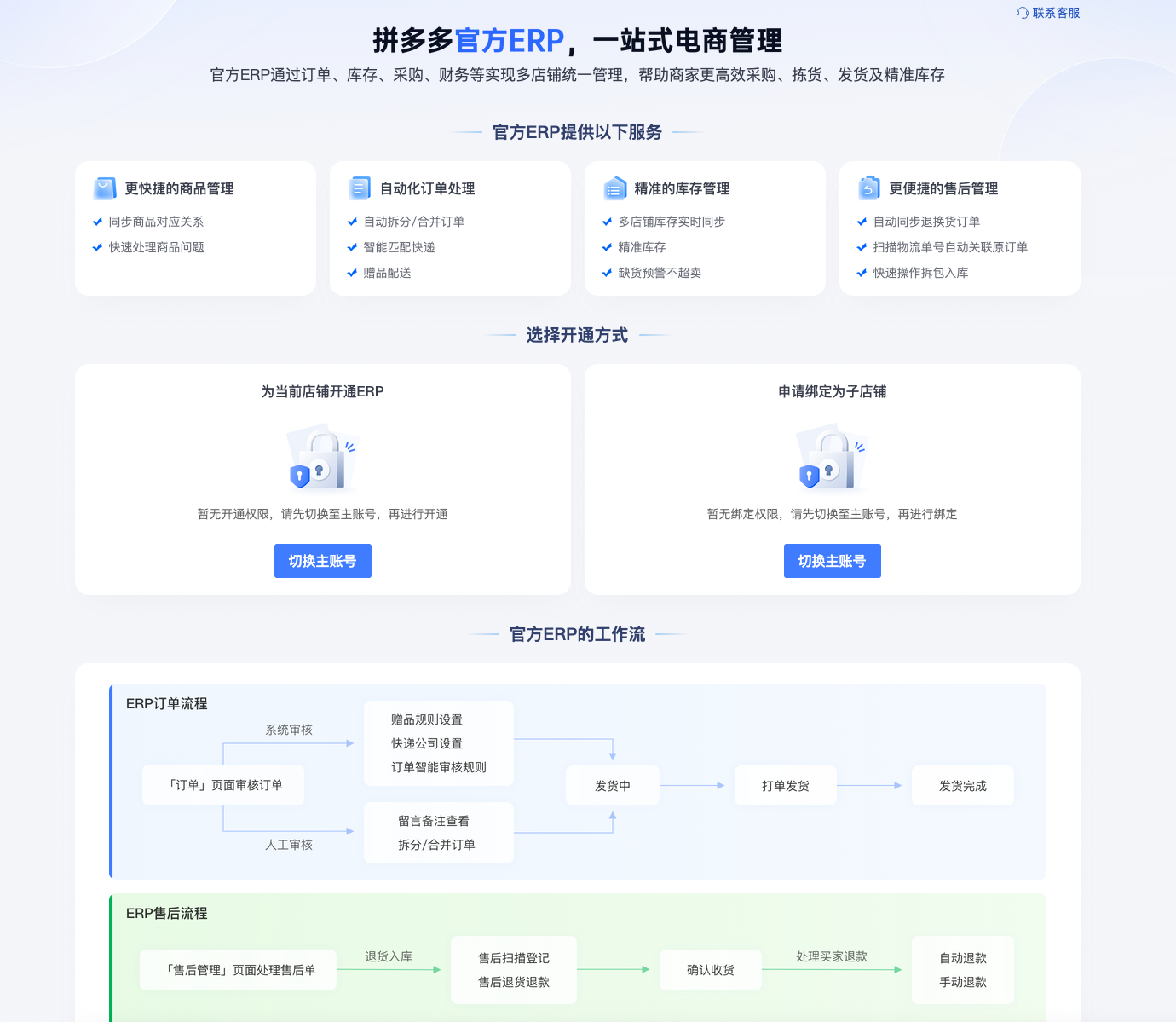 此外除了竞争激烈(某排名第二的ERP已经多次不请自来的直接登门我司来推销他们的产品),不少平台也在推出自己的简易版ERP系统,比如拼多多、淘宝等,均有基于自己自身平台推出的简易版的ERP系统,如果商家只是经营某一家平台,或者单量不大场景也不复杂的情况下,平台提供的ERP系统也是足够使用的。