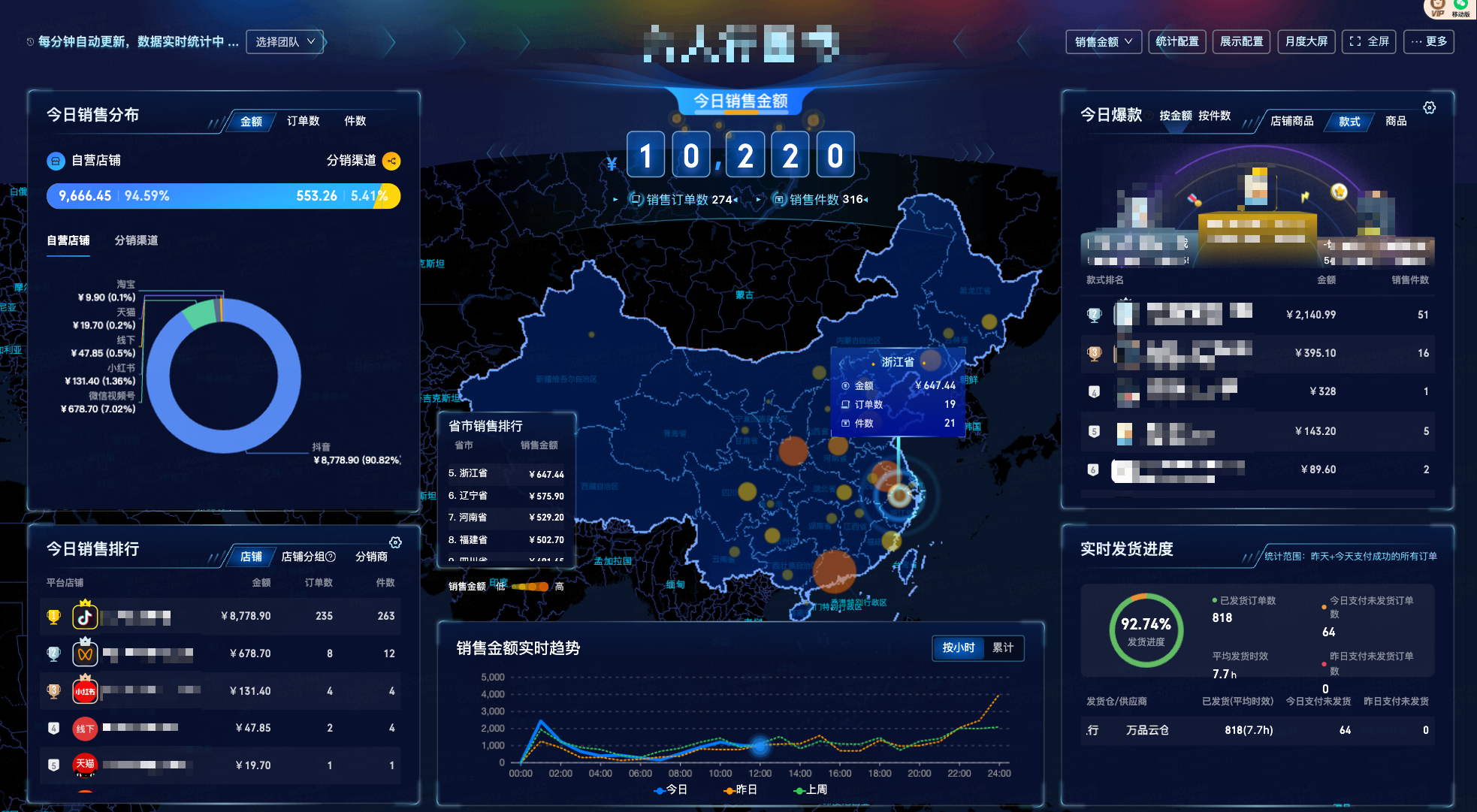 除此之外,聚水潭的协同工具可能是其另外的收入部分,比如如果你想要类似于数据大屏,聚水潭就有数据智能的服务,可以方便的看到热销的产品、订单的金额、主要来自哪些店铺等等。此外还有物流监测,可以提前发现停滞的快递等等。