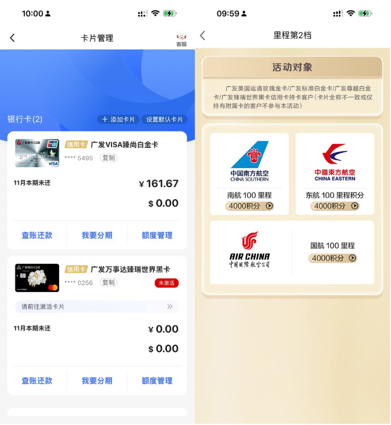 然后是广发,之前心心念念的广发万事达臻瑞世界黑卡,终于获批,但是在我激活之前,我留了个心眼,去看了一眼里程兑换的详情,结果发现,现在只有国航、东航、南航三家航司了,国泰亚洲万里通、海航吧还有一家什么航司,在当时看的时候还是暂停兑换,写这个稿子的时候,连那三家航司的logo都去掉了。