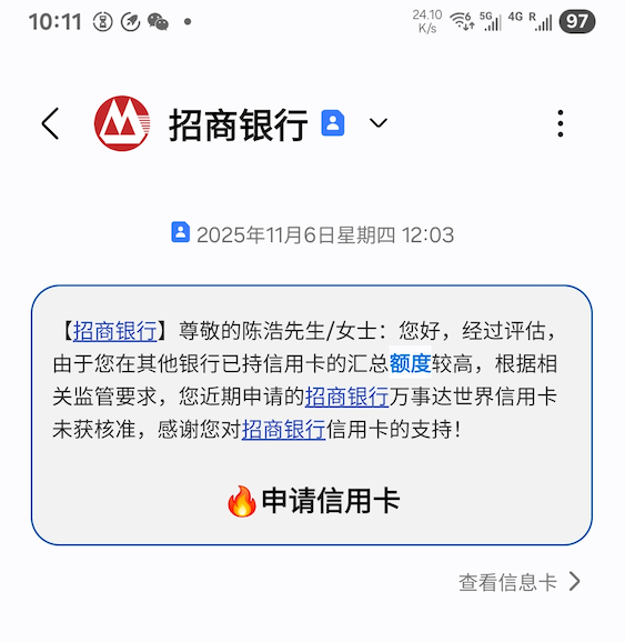 再接着是招行,可以说是年度意难平了,申请了两三次招商银行万事达世界卡,全部被拒,理由是总授信额度太高,除了中信和招行之外,交行是7000、广发是5万,就浦发的额度比较高了。浦发降过之后保留了大概10万的额度,也还是不行。甚至最近发现附近商场里面有个招行的摊位,我甚至都想去那个摊位问问,但是感觉也不一定靠谱……纠结。