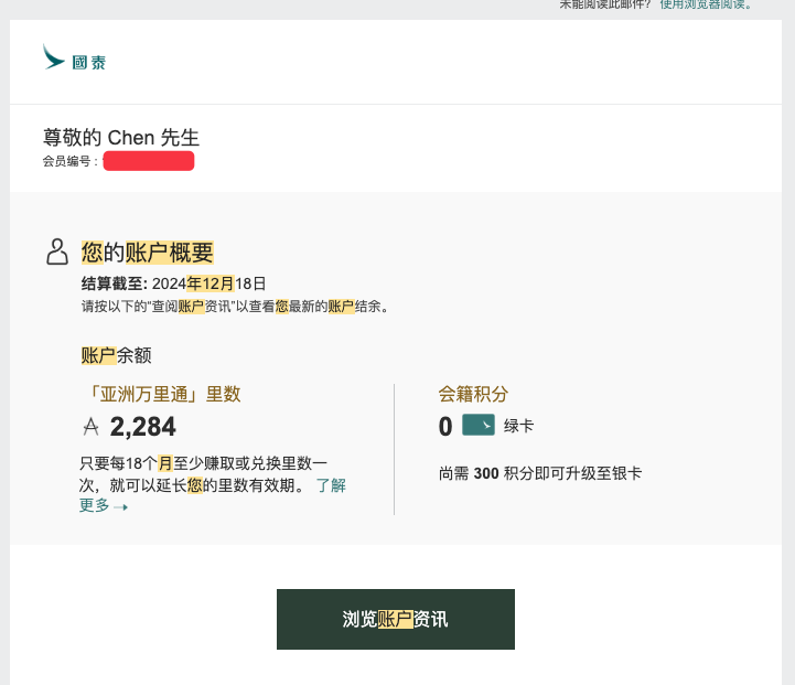 国泰航空亚洲万里通今年就是各种累计了,甚至可以说前面的大部分内容、大部分的折腾都是为了国泰。比如万豪的积分转换成亚洲万里通、坐飞机都优先国航的航班、中信国泰卡找合适的消费累计、积极的参与活动,反正是能用的合法的办法都尽量用了。从去年年底大概2284里,变成了16255里。