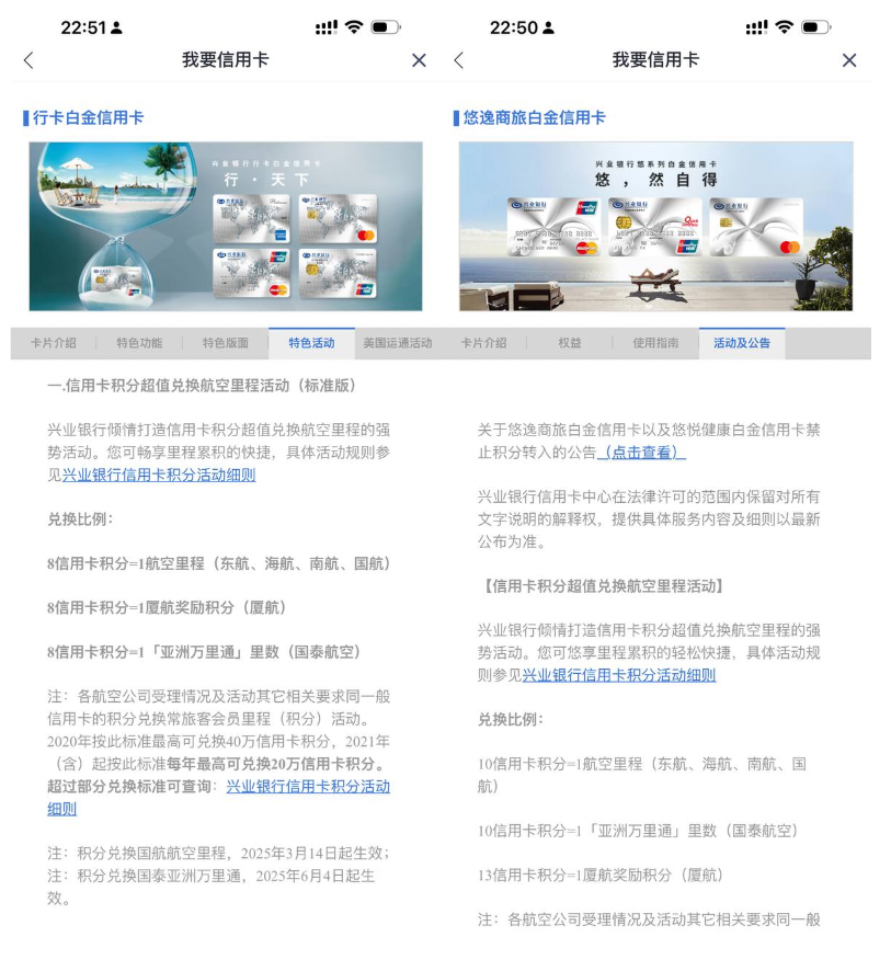 根据兴业详情页的介绍来看,兴业银行行卡白金信用卡是可以做到8积分1里程,而且不只是亚洲万里通,国航东航南航海航厦航均是如此。兴业银行悠逸商旅白金卡可以做到10积分1里程,而且同样覆盖广泛,仅有厦航的比例特殊为13比1,其他的均为10比1,也非常划算。